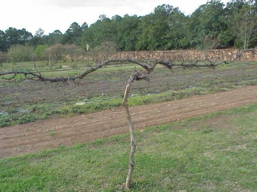 A properly trained vine has a trunk, two arms and fruiting spurs. The first two years of training are devoted to developing the permanent trunk and fruiting arms. In the spring following planting, each plant will produce three or four shoots. When these shoots are about one foot long, select the strongest and remove all the others. Tie a string to a small stake. Drive the stake in the ground about three inches from the plant.