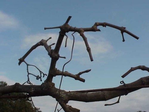 Remove tendrils that wrap around the arms or spurs. (Tendrils are finger-like plant parts Muscadines use to attach themselves to their supporting structure.) If tendrils are not removed, they will girdle the arms or spurs and cause reduced production.
