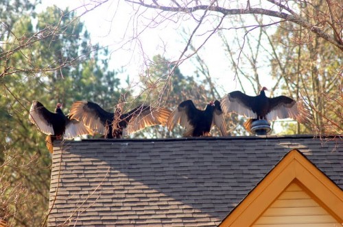 We love our migrating buzzards! It is so much fun to stand on our deck on a cold windy evening and be part of the “kettle” of vultures as they play on the wind. Vultures are terrible at landing however. It sounds as if whole limbs are being knocked out of trees by the large birds trying to arrange themselves to their liking. As the months progress, some nights they don’t come in and eventually they cease to come in, then usually toward the next migration back north, buzzards straggle back in. On really cold mornings you see two or 3 who sleep until nearly noon. I always wonder about them – are they the old ones? And then, suddenly, they are gone until next year.