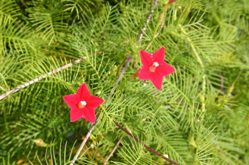 Q: In the past I have collected cypress vine seeds and re- planted each year to have beautiful vines and flowers. This year I wanted to planter boxes and plant so they would grow up a spot where I had a lattice wall. As you can see the vine has grown beautifully but no flowers. What went WRONG?