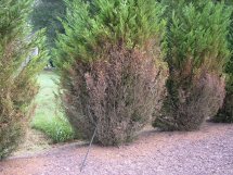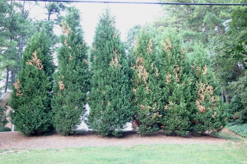 They were very healthy until this summer, when die-off of needles began at one end of hedge. The damage starts at the bottom of each tree near the trunk and works “up and out” from there. So far, the outermost needles are not affected. Your thoughts?