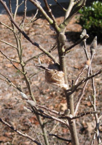 Q: In February I found a strange tent-shaped attachment on a stem of my tulip tree (saucer magnolia). It is brownish and feels like Styrofoam but it will not peel off from the stem.
