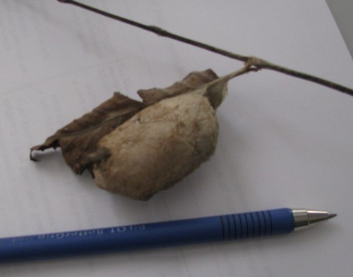 A: Wow – it’s a praying mantis egg case and it’s huge! Lots of little mantids are inside, waiting to hatch.