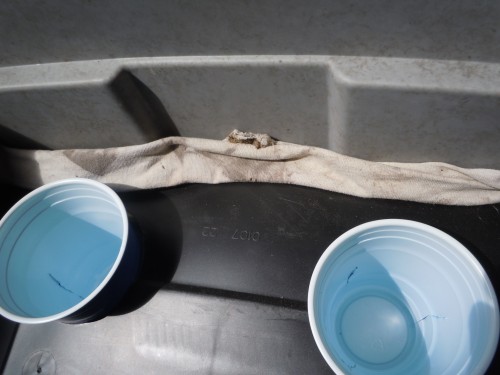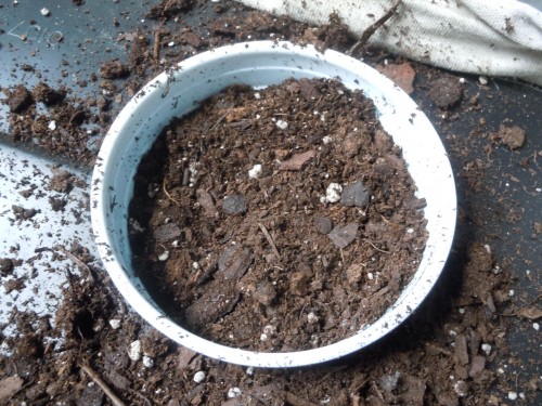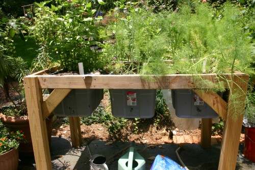 Seeing several self-watering gardens on YouTube, I decided to make my own…and it has been a rousing success! (see the first photos). Water sits in the bottom of the tub and is wicked upward gradually by the compressed soil in the cups.
