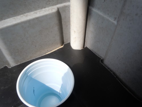 now cut a piece of 1″ plastic pipe long enough to extend above the top of the tub