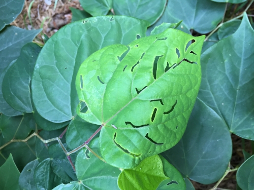 He diagnosed the C-shaped, curving holes as being caused by cranberry rootworm, which, despite its name, also feeds on new leaves of rhododendron and camellia.