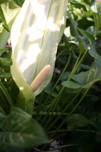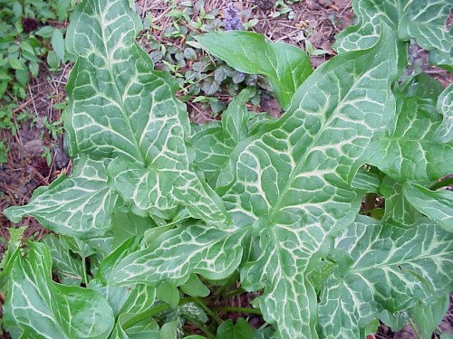 I just can’t figure out why a certain plant I have in my garden is not used more frequently. It is commonly called by its scientific name Arum italicum ‘Pictum’, but the Home and Garden Encyclopedia says another common name is “Cuckoo Pint”! I got my first plants from my friends Chip and Ingrid, who had lots of the arum growing under the oak tree in their front yard. I admire the glossy green leaves, veined in white, that appear in fall and persist in clumps through the winter. Soon this spring a greenish-white spade-like flower (a spathe) will unfurl in the center of each plant. In early summer, the center of the spathe becomes a green spike covered with green berries that change to brilliant orange by August.