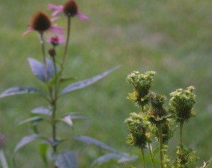 For whatever reason, homeowners in 2004 noticed many more instances of “odd” coneflowers than in previous years. The most common description is that the central “cone” of the flower is misshapen or that it has tiny flower growing from it. Some noticed that the petals of the flower (technically called rays) have turned green rather than purple or white.