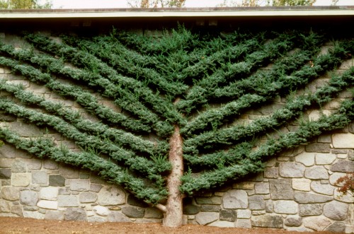 Espaliering is the art of training a plant to grow in a formal pattern, typically in a flat plane. Fans, double cordon, vertical cordon, palmetto, and Belgian Fence are common shapes but there is no reason to limit your imagination when it comes to training plants.