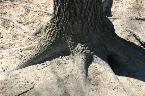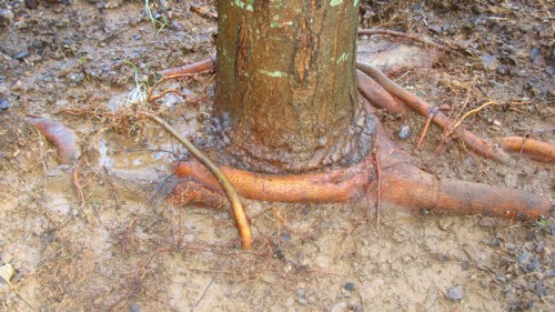 When a root closely circles a tree trunk rather than growing outward, it is called a “girdling root”. The situation usually starts when the tree is young. Somehow a root begins circling the trunk. As it grows larger and the trunk expands, pressure against the tree base limits water and nutrients going to the leaves.