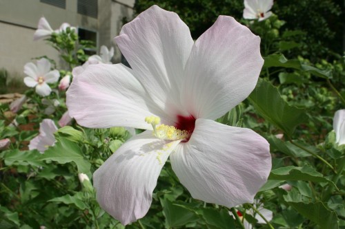 My summer landscape includes Rose of Sharon (Hibiscus syriacus), tropical hibiscus (H. rosa-sinensis) and scarlet hibiscus (H. coccineum). A regular morning route takes me past a big clump of swamp mallow (H. moscheutos) and a gorgeous Confederate rose (H. mutabilis) on Scott Boulevard. Some of my reading material later in the day might be printed on paper containing the fiber-substitute kenaf (H. canabinus).