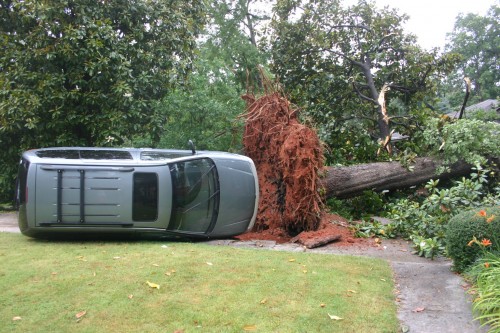 Driving to dinner with friends after a big storm, I came upon this. A big tree next to a driveway fell and flipped over the car on the driveway!