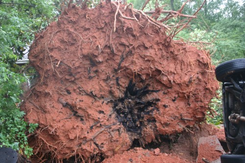 Notice one particular point – trees growing in our clay soils don’t have taproots. The roots spread out in a pancake fashion beyond the drip line to give anchoring strength. It wasn’t enough for this tree though!