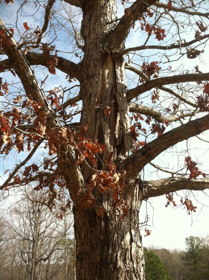Q: I planned to incorporate this lovely Oak into our new home’s landscape. Last year I noticed splits in the bark and suspected lightning. Now, I suspect a vine, NOT visible at the base…growing UNDERNEATH the tree bark? Do you think the tree will survive?