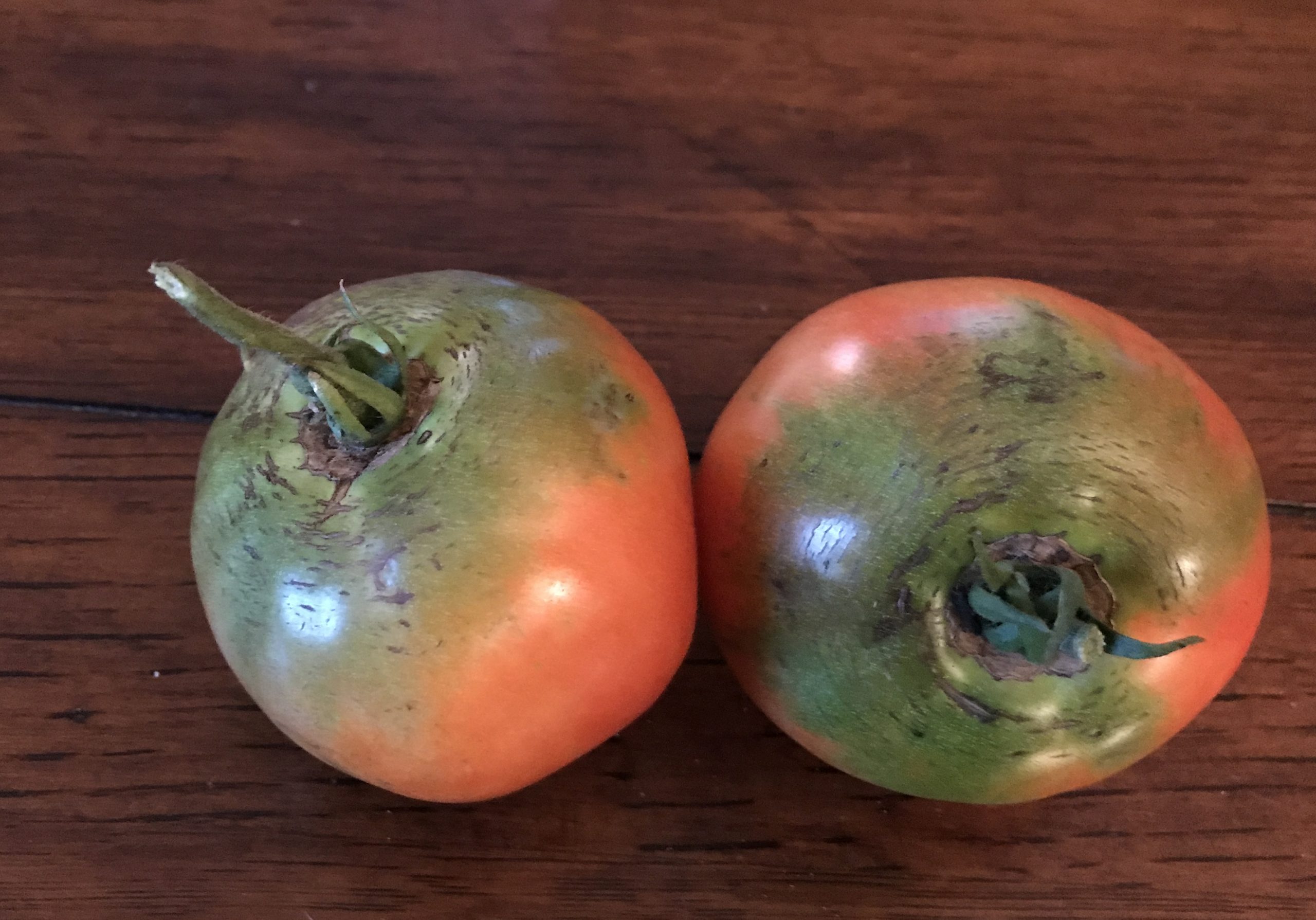 Q: Last year and again this year our tomatoes have this “wood grain” look on the top of the fruit. What can we do to correct this?