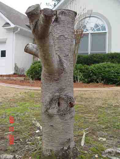 Q: This was a healthy tree about 15 to 20 feet tall, the diameter of the trunk was 18 inches. My Homeowners’ Association landscape maintenance sub-committee requested that this tree be pruned so the people that cut the grass came out and pruned it. Now is only 36″ tall with no limbs.