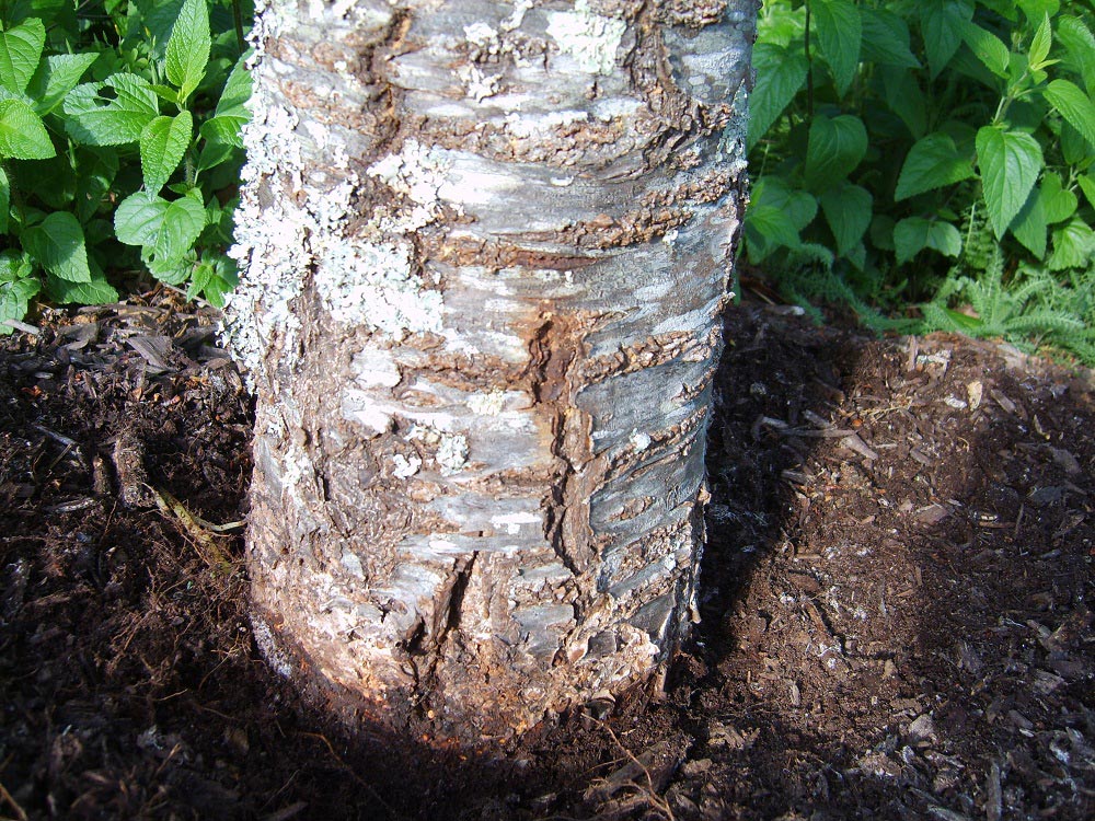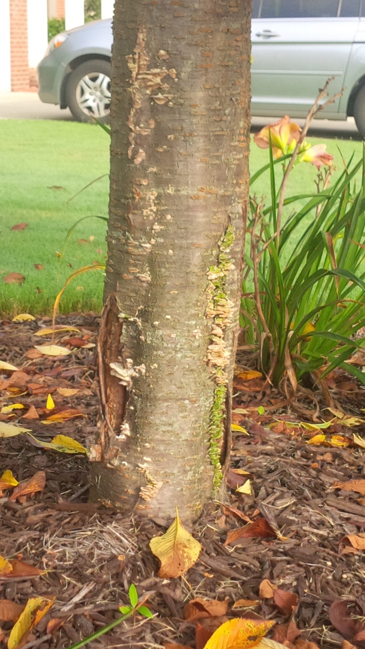 Q: I have a four year old Yoshino cherry. The trunk is splitting vertically, and there is a strange wound (maybe mechanical damage) on the trunk. One of the splits has fungus growing on it. The leaves seem to drop every year in late summer and by September, they are all gone.