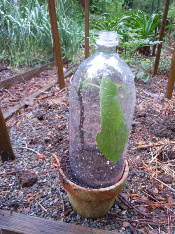 Watch the bottle for condensation on the plastic. When none is seen, water the potting soil. The cutting should have roots by fall, when it can be planted in your garden.