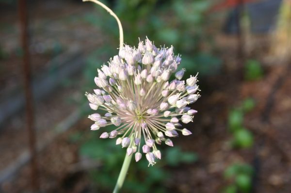 Garlic begins to bulb when the days get longer in May and June. The larger the plants at that time, the larger the bulbs will be, so it is important to keep the plants growing healthily. If a flower head begins to develop (it looks like a round spear), snip the stalk off to force energy back down into the bulb. Harvest garlic as soon as most of the leaves have turned yellow, usually in early summer. Dry garlic keeps much better than onions. Save some of the very best bulbs for planting the next season.