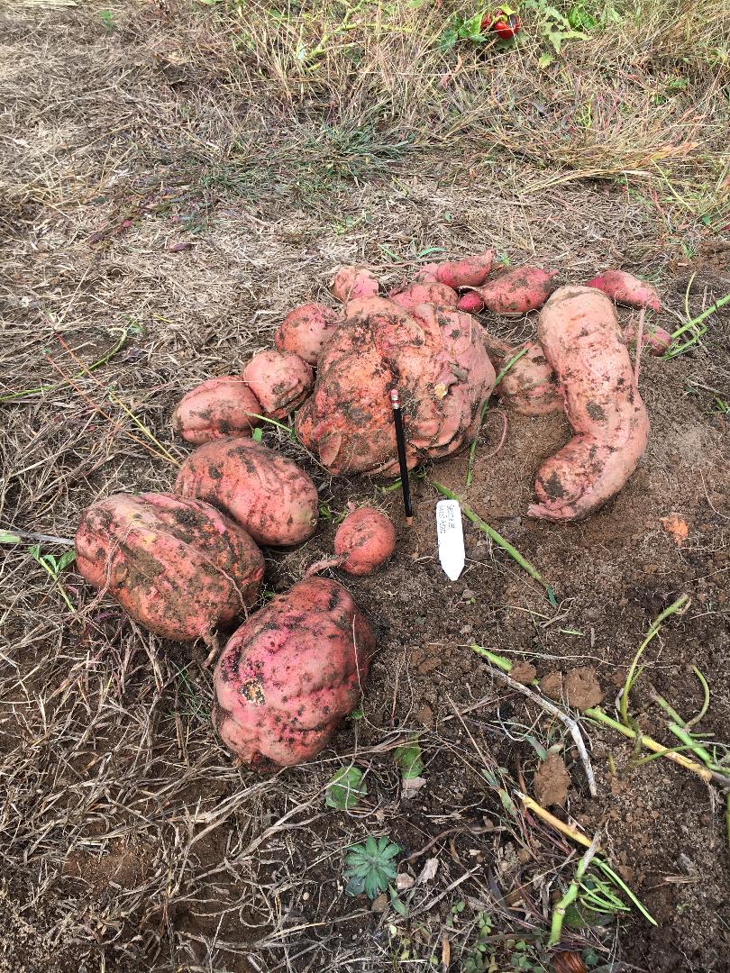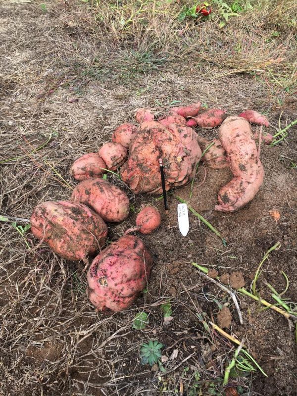 Q: I have grown sweet potato’s before, but have never seen anything like this. This is the first year for our garden. The sweet potatoes that I dug were malformed and very large. These were Georgia Jet variety. One was almost completely round, with a 10”diameter, like a basketball. Any idea why they turned out this way?