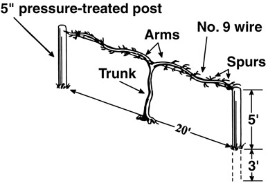 A properly trained vine has a trunk, two arms and fruiting spurs. The first two years of training are devoted to developing the permanent trunk and fruiting arms. In the spring following planting, each plant will produce three or four shoots. When these shoots are about one foot long, select the strongest and remove all the others. Tie a string to a small stake. Drive the stake in the ground about three inches from the plant.