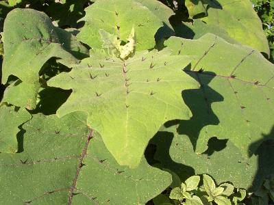 A: The plant is one I first saw at Callaway Gardens. Though the spines are fearsome, the plant was a real show-stopper. It is kin to the tomato and eggplant. It’s common name is “naranjilla” but its scientific name is Solanum quitoense ‘Lulo’. The orange fruits are filled with a jelly which tastes like a mixture of pineapple and lemon. It is used for drinks and sauces in the Andes.