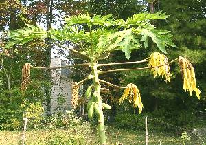 Q: I am sending you a picture of my papaya tree. I planted the seed in my garden last year. It was about 2 feet high when I transplanted it to a large pot and put it in the garage by a window last fall.