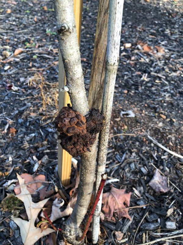 Q: I planted three peach trees last year and one of them has a growth about ten inches off the ground. I want to prune the trees this year to get the canopy growing correctly but am concerned about this growth. It is very hard to the touch.