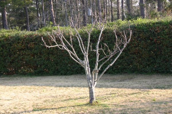 A: The “open center” method of pruning a peach tree results in a tree that has a short central trunk with three or four main limbs radiating outward. The effect is like a wine glass, having a short stem and an open bowl above.