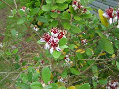 A: It’s a pineapple guava, Feijoa sellowiana. Collect the egg-sized fruit in autumn, cut it in half, then scoop out the pulp with a spoon. The flower is edible as well…it tastes like cinnamon.
