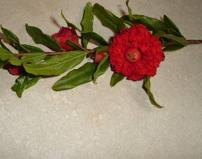 A: It’s a double-flowered pomegranate…maybe ‘Chico’, which produces no fruit except the “hip” you saw.