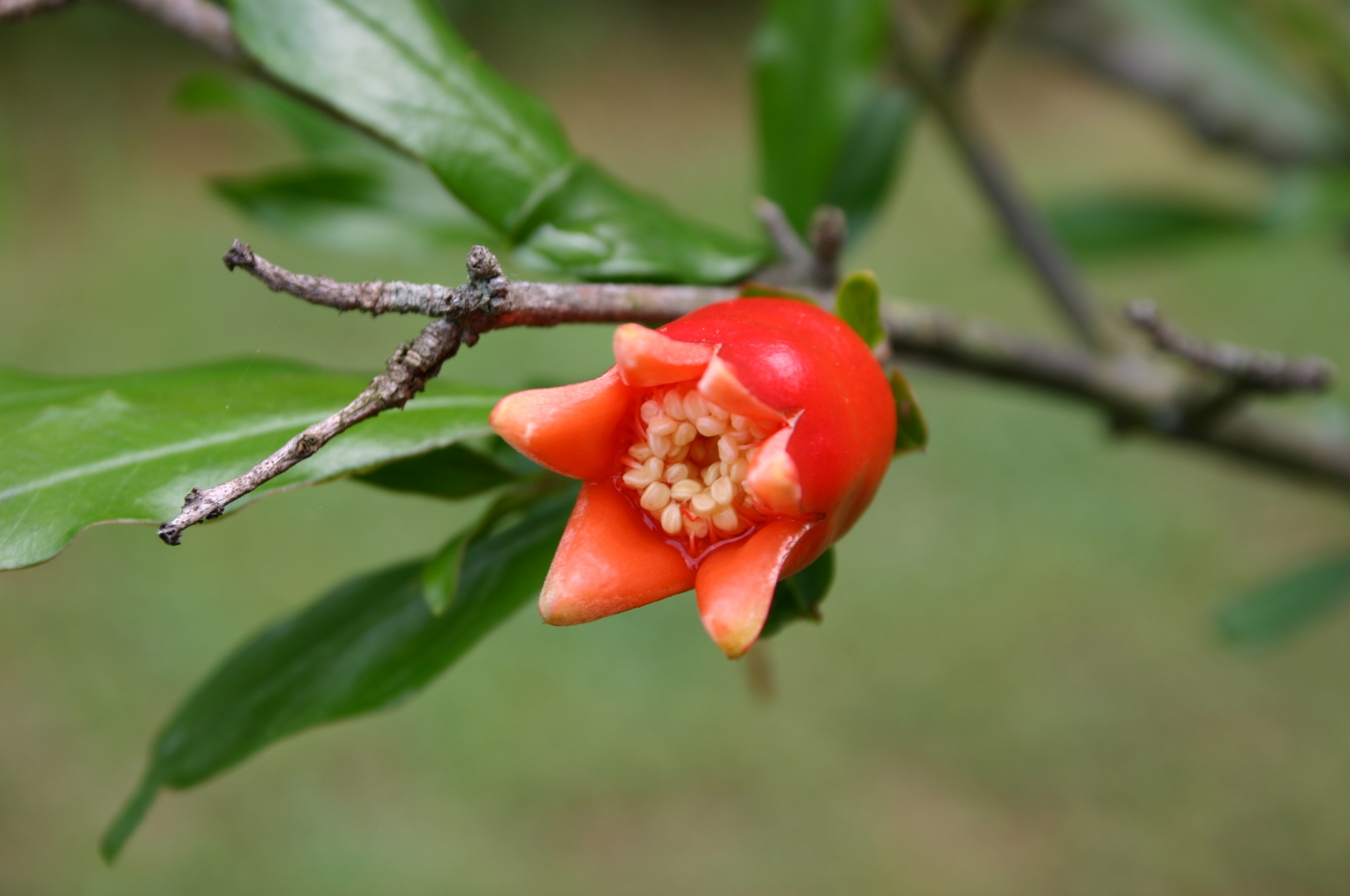 Orange-red, bell-shaped flowers appear on new growth in the spring and summer. The leathery fruit contains numerous seeds surrounded by sweet pink, juicy pulp. One way to enjoy the fruit is to roll it firmly on a hard surface then cut a hole in the end to suck out the juice. This is best done just before you bathe because pomegranate juice stains are difficult to remove from clothing. Commercially, the juice was once used to make grenadine syrup, the red coloring in a tequila sunrise mixed drink. Pomegranates make nice ornaments for fruit bowls or Christmas wreaths.