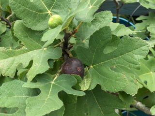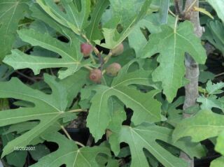 A large black fig with light strawberry pulp. Heavy crop of brebas: pyriform with a prominent thick neck; main crop figs are smaller and more variable, Leaf: base calcarate; 5 lobes; latate. Distinctive, rich flavor. Well-adapted in California. Very vigorous, but not hardy. Often infected by mosaic which mottles the leaves, but does not seem to effect the crop. One of the best where adapted. Good fresh and dried. Synonyms: Franciscana, Black Mission.