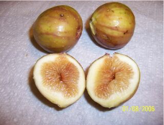 FlandersA medium, yellow fig with violet stripes and amber pulp, bred and released by Ira Condit in 1965. Pyriform with a long slender neck. Leaf: base cordate to calcarate; eye often nearly closed; leaves: 3-5 lobes, latate. Excellent flavor and suited for all uses. Plants are vigorous, but do not seem to be particularly hardy. Good breba crop. Main crop ripens late. Well adapted in south coast and San Joaquin Valley, California. Deserves trials in the South. Synonym: Verdone Hybrid.