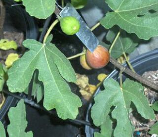 Small to medium fig with light brown to violet skin and straw- berry pulp. Pyriform with tapering neck. Small, closed eye. The eye remains green until the fig is almost ripe which allows it to be easily distinguished from Brown Turkey the eye of which turns red quite early. Leaf: typically small; base subcordate; 3-5 lobes; margins crenate. Very cold hardy. [Condit and other experts write that Celeste will not bear on new wood in years in which it is frozen back. There are some strains, possibly the original, of which this is true, but J. Stewart Nagle has identified at least two strains which will bear on new wood. I also have one that bears on new wood after a freeze and is otherwise indistinguishable from the Celeste Condit describes.] Excellent fresh, dried or as preserves. Breaks up when stewed. Main crop only. Well-adapted in the Eastern United States, but usually unsatisfactory in California and the Southwest. Synonyms: Blue Celeste, Celestial, Conant, Honey Fig, Sugar Fig, Malta (after its supposed place of origin), and Tennessee Mountain Fig (which may be an even hardier bud sport).
