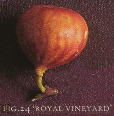 A medium bronze to brown fig with light strawberry pulp. Brebas are pyriform with a prominent thick and curving neck. Leaf: truncate to subcordate; 3-5 lobes; upper sinuses shallow and narrow; margins serrate. A San Pedro type. Brebas only! Condit says the breba crop is typically small. Not worth growing in parts of the South with late frosts which destroy the fruit in most years. I discarded my own Royal Vineyard in 1995 since it had only produced two fruits in ten years. The plant is vigorous and might deserve trialing in the North and West. Synonym: Drap d’Or