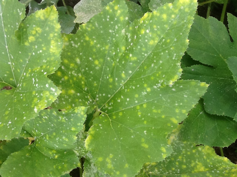 The leaf disease runs rampant in squash when weather is warm and humid. Try to stop its spread by thoroughly spraying with chlorothalonil (click for sources).