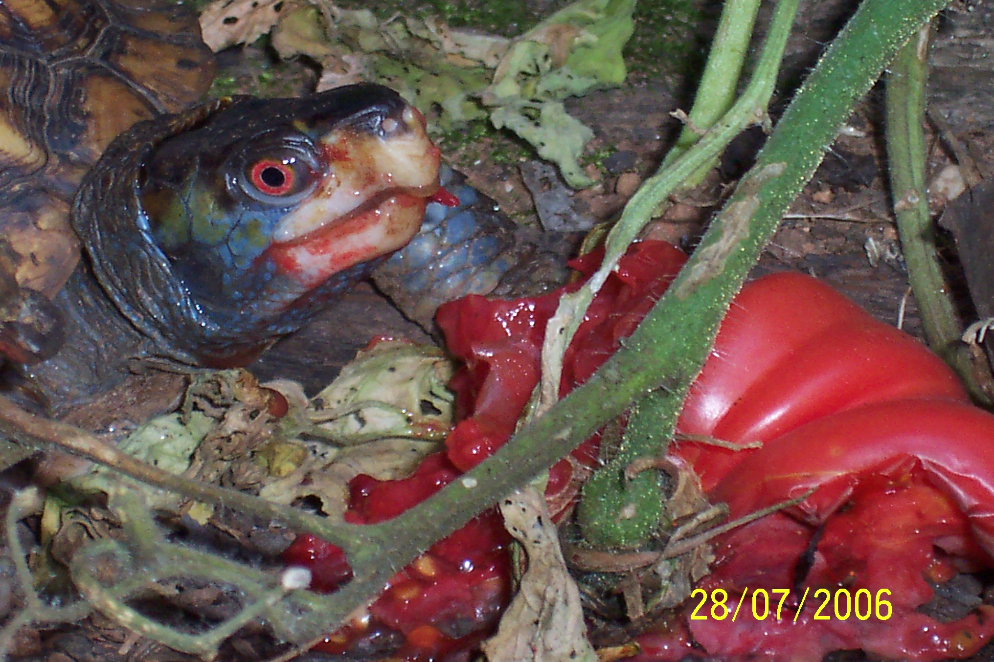This morning I spotted a turtle about 6-8 inches long resting next to the tomatoes and 3 ripe fruits had been bitten off again. It ate the rest of damaged fruits, which I gave her.