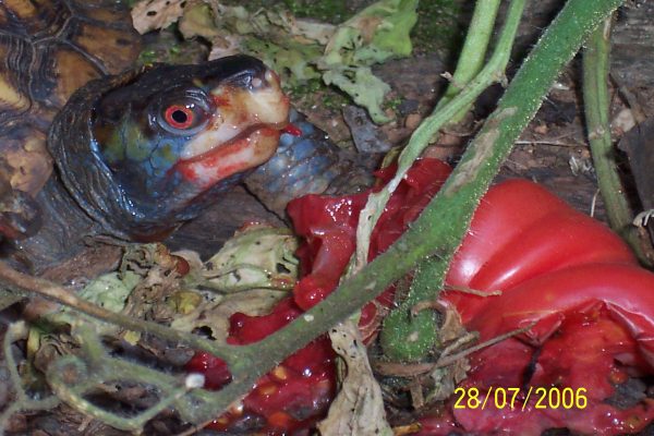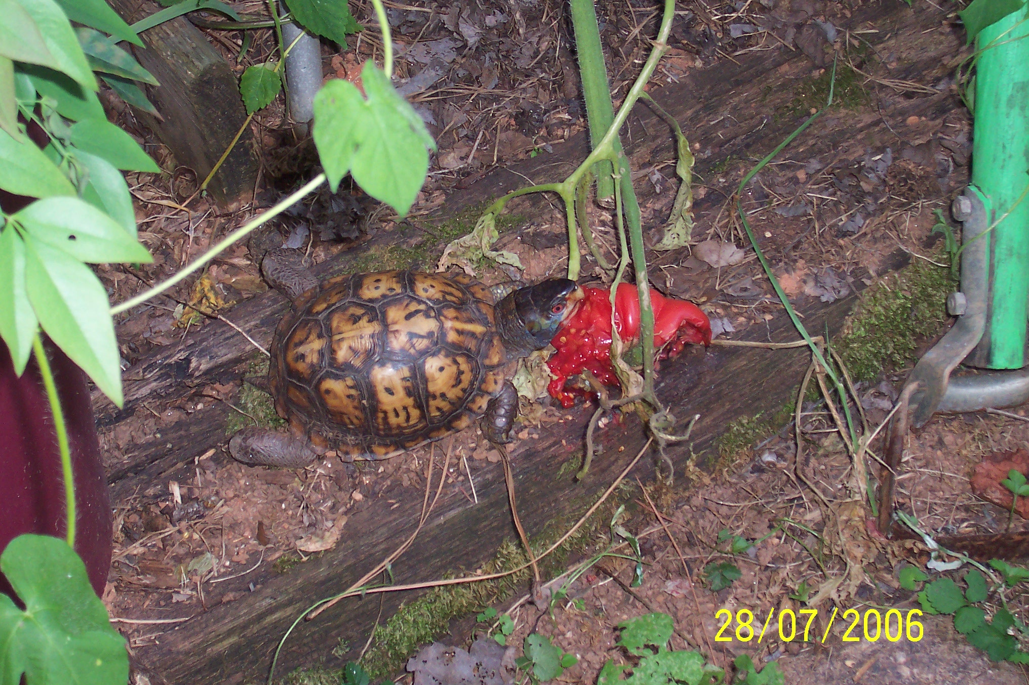 A: Box turtles can certainly eat tomatoes…but they can’t climb. Squirrels and birds are the likely culprits for the damage in the upper reaches of your tomatoes.
