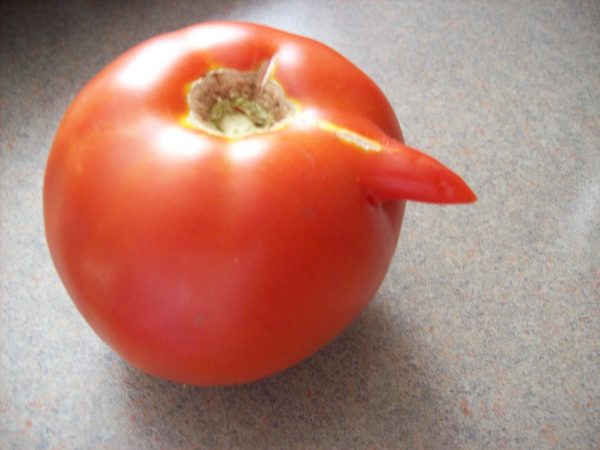 Q: I noticed last week that one of my few tomatoes growing on my tomato plant in a pot was two-toned.  I’ve never seen one of these before.