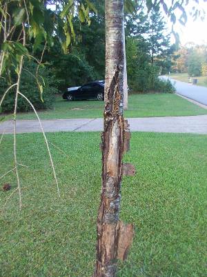 Q: I’ve had a weeping cherry for six years. It bloomed beautifully for three years, then started declining to only a few flowers each year. This past year it never bloomed and did not produce leaves until June. This is when I noted the trunk of the tree. What should I do now?