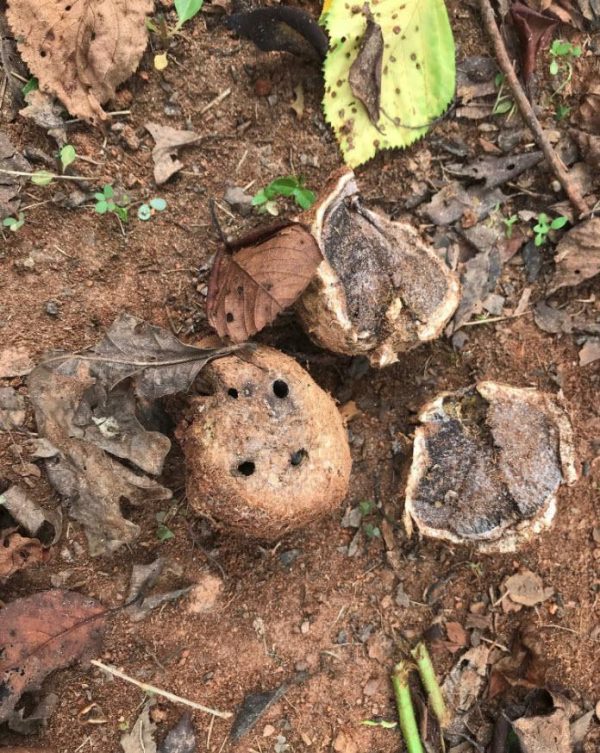 A: It’s a puffball. There are thousands of species in the world and dozens in Georgia. They usually emerge as an inconspicuous ball from the ground in spring. They grow larger as they consume organic matter in the soil. Over a period of a few days, the skin of the puffball hardens and cracks, revealing the millions of spores within. Occasionally kids find a puffball before it cracks open. They delight in kicking it, releasing brown “smoke” (spores) around their shoes. A small percentage of the spores find a propitious place to grow and help nature continue its mission of breaking big things down into smaller bits.