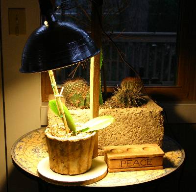 Buy a shiny aluminum “clamp light” at a hardware store. Screw in a fluorescent bulb equivalent to a 100 watt incandescent bulb (usually 20 – 25 watts). The light fixture must be placed as close to the plant leaves as possible! Fluorescent bulbs more that four feet away give almost no useable light to a plant. Warm white/daylight bulbs will give the plant more of the light spectrum they would find outdoors.