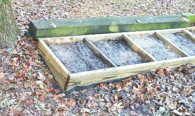 The 3 dividers are two feet long 2″ x 8″ spaced 2 ft. apart to create four 2 ft. x 2 ft. boxes in each big box. (The home improvement store cut the wood for me.)