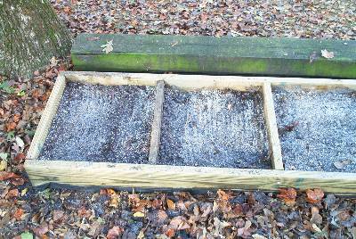 Weed cloth is stapled to the bottom of the entire 8 ft length to retain soil but allow drainage. The box is placed on a bed of leaves, providing for additional drainage and keeping the water from pooling under the box.