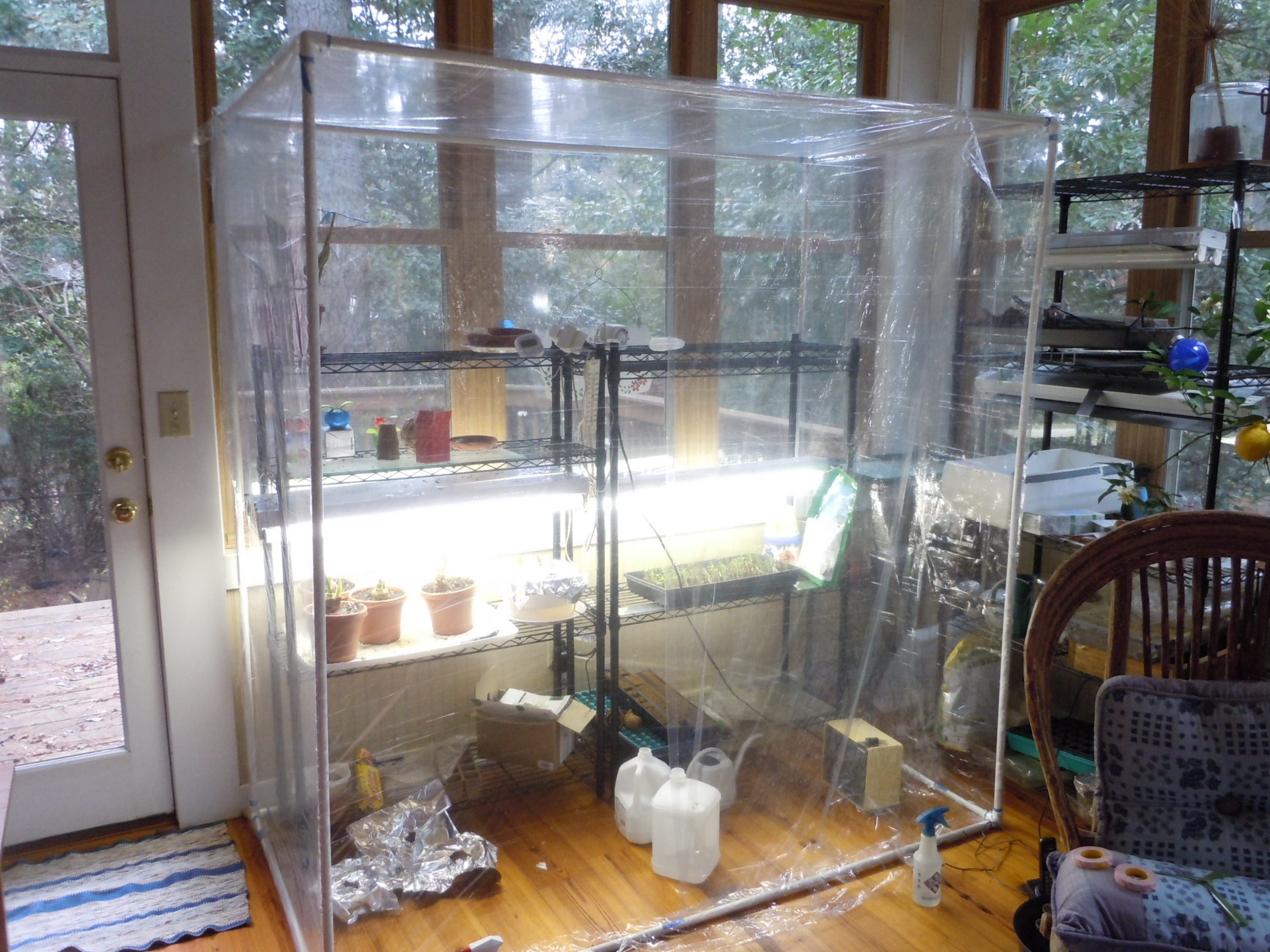 A few weekends ago I mentioned that I had built an enclosed greenhouse on my unheated sunporch. The new growing space is in front of windows but it also contains two shelving units with fluorescent lights plus a small space heater connected to a thermostat.