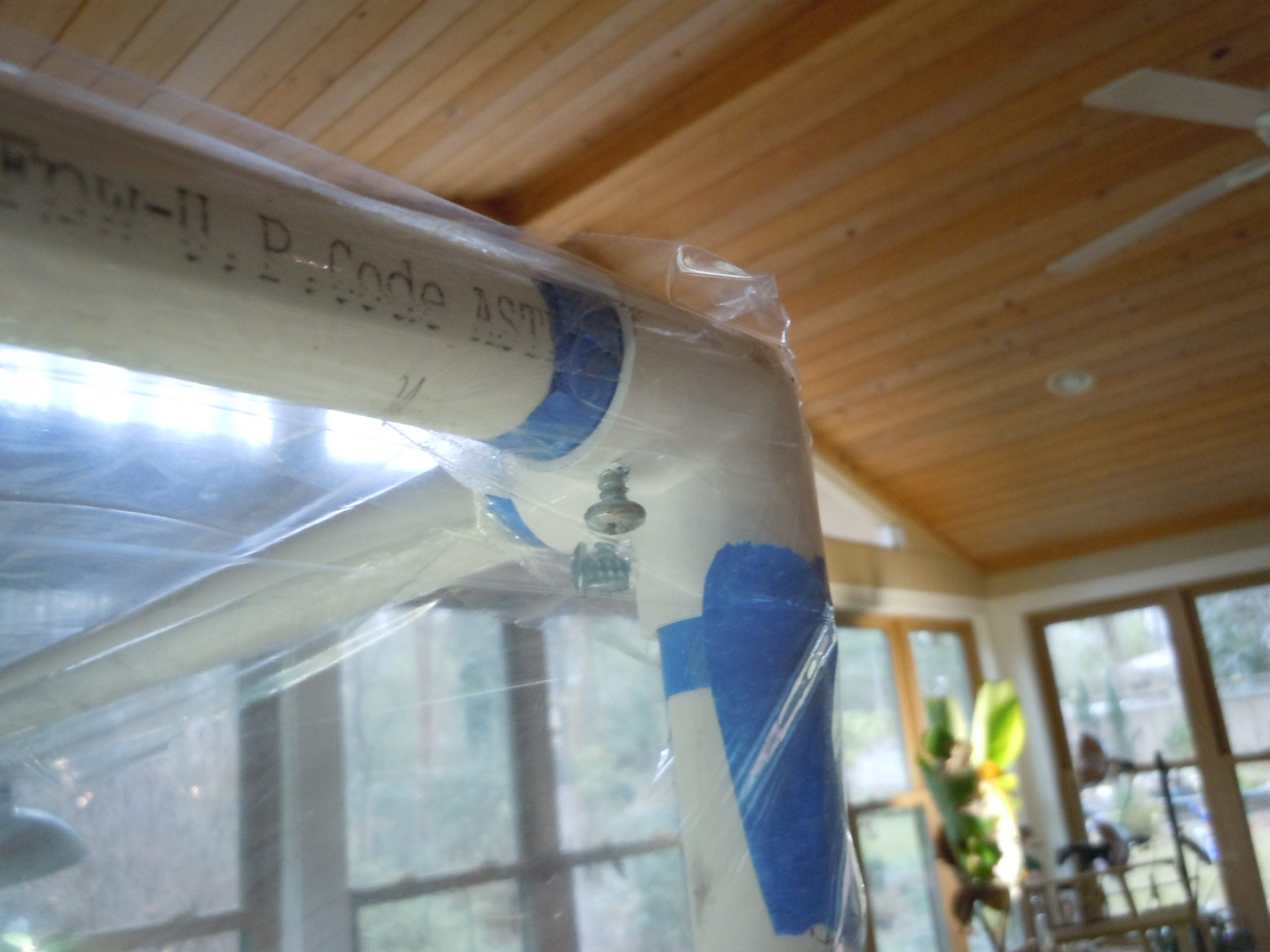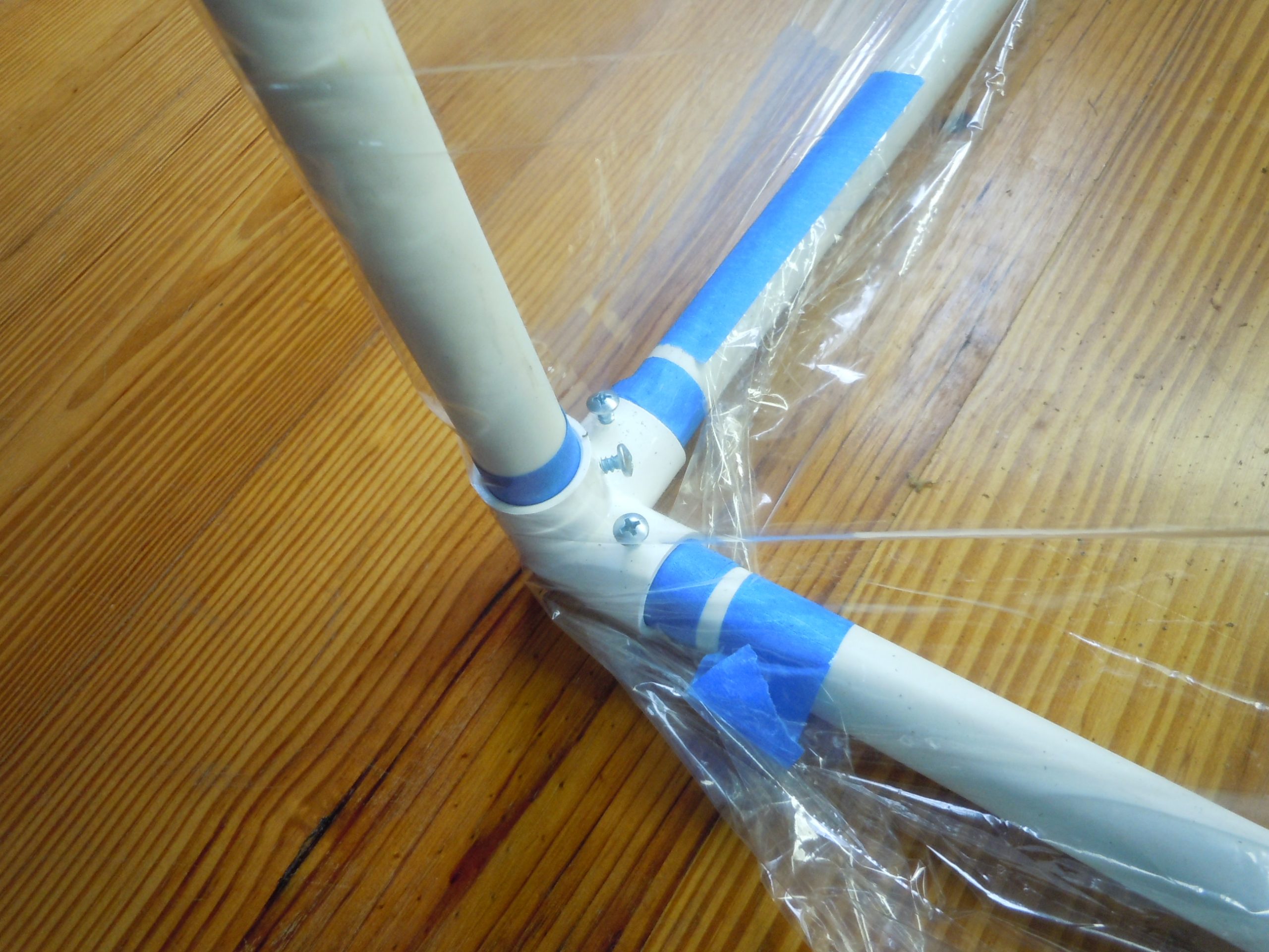 I got the PVC corner fixtures from U.S. Plastic. I bought pieces that fit over 1/2″ PVC pipe but noted that their corner pieces are slightly larger than standard hardware PVC pipe. I simple wrapped the ends of each pipe piece with masking tape to make it fit tightly. I used #8 3/4″ screws to hold the pipe in the sockets, after drilling a 1/8″ pilot hole for each.