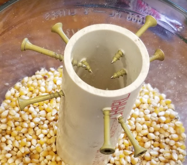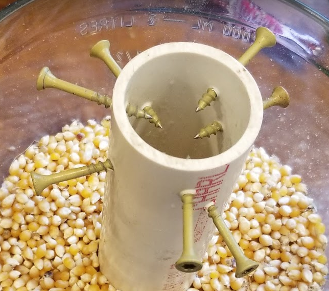 Q: Here is my DIY popcorn sheller. I don’t know why more people don’t grow popcorn. Especially folks with kids. So easy to grow and fun!