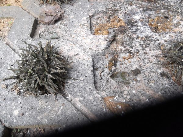 Q: Shortly after we had these pavers installed we noticed a small gray patch of something. It slowly grew to a large gray patch. Now we have a second gray patch. And the first patch has developed little white flies. Any idea what we might have here? Note: the little white things that look like lint are alive. They move under their power and appear to go airborne when the wind blows.
