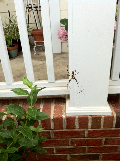 Remarkably large garden spiders are often seen in fall. They are black with yellow markings on their underside and their webs stretch across garden paths and between flowers.